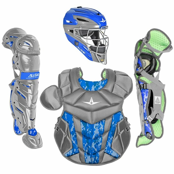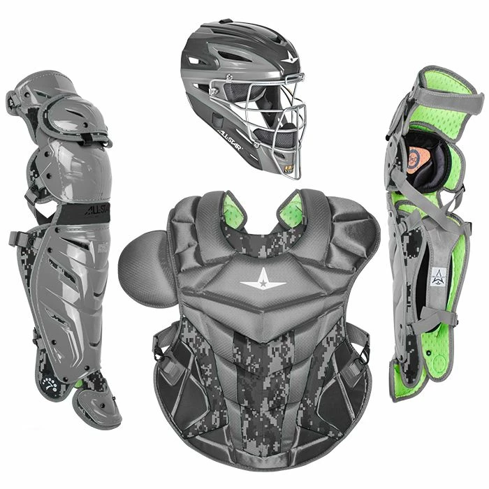 The All Star Adult System7 Axis Camo Pro Catchers Set – CKPRO1XDC is headlined by a MVP2500GTT mask, a CP40PRO chest protector, and LG40WPRO leg guards. This set is headlined by a Graphite Base and Digi Camo Accent Color Profile. It also includes Diamond Port Ventilation, thinner, more form fitting Delta Flex harnesses, more aggressive break-points for an improved fit and better blocking, and a LINQ pivoting hinge. Together, these components contribute to one of the most unique forces in the game. Especially since no one else provides the LINQ pivot hinge besides the Adult System7 Avis line of catchers gear. This feature allows leg guards to completely move with the player. Additionally, this Camo kit is available in the following accompanying colors: