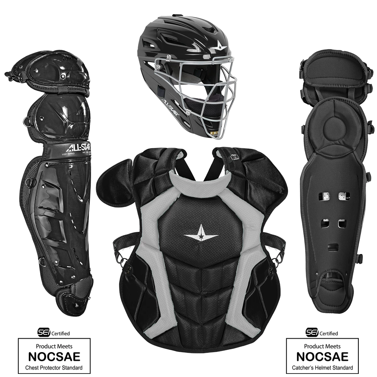 The All Star Classic Pro catchers gear set CKCCPRO4 has a NOCSAE certified chest protector. This catchers set is a perfect choice for a player s first set of professional adult catching equipment or for outfitting a high school or college program. This catchers set is available in four different colors: Black, Navy, Royal, and Scarlet. This makes it a set that can potentially match a few select team colors. In addition, the set consists of three other All Star products available for individual purchase: