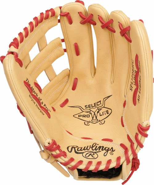 Rawlings Select Pro Lite series gives youth players the chance to wear patterns inspired by their favorite big leaguers! This Rawlings Select Pro Lite 12-inch Baseball Glove is based on the gameday pattern of superstar Bryce Harper. That makes it the perfect companion to any up-and-coming outfielder looking to hone their defensive skills. Our glove craftsmen made these with a lightweight, soft leather shell for durability and quick, easy break-in. In addition, the cushioned fingerback lining and palm padding provide a comfortable fit with maximum shock protection. Give your youth ballplayer a solid foundation to build on in the outfield. Get your Select Pro Lite 12-inch Baseball Glove today!